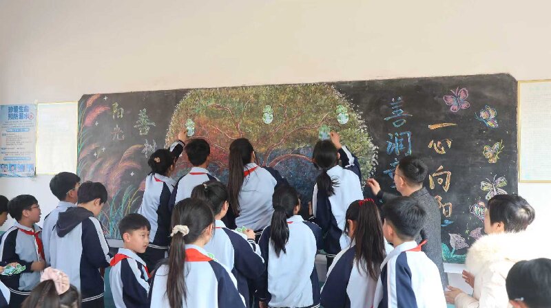 活动的“善种子”环节将现场氛围推向高潮。学生们将亲手绘制的心愿卡——写满“长大后参军,报效祖国”“当一名医生救死扶伤”等梦想的“善种子”张贴在黑板上的“阳光善树”上。一棵枝繁叶茂的“善树”瞬间缀满五彩心愿,象征着慈善精神在孩子们心中生根发芽。孙丽萍会长与学生们合影留念,定格下这充满希望的瞬间。